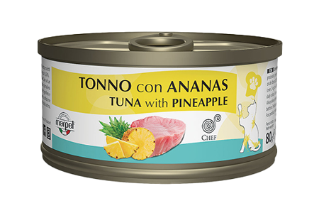 COMPOSIZIONE: Pesce (tonno) 60%, prodotti e sottoprodotti della trasformazione di frutta e verdura fresca (ananas) 5%, riso.