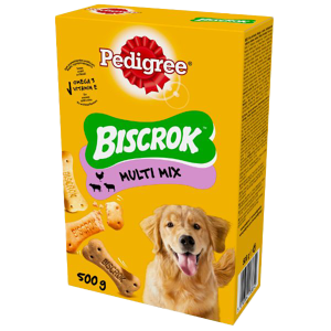 Pedigree Biscrok Multi Mix sono biscotti ricchi di vitamine e minerali, per cani adulti. Alimento complementare per cani adulti. Biscotti deliziosamente croccanti in tre varietà, cotti alla perfezione.