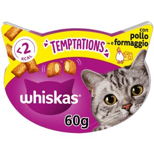 Alimento complementare per gatti adulti, Whiskas Temptations sono deliziosi fagottini croccanti con morbido e succulento ripieno, ideali per un irresistibile spuntino del tuo gatto in confezione da 60 g.
